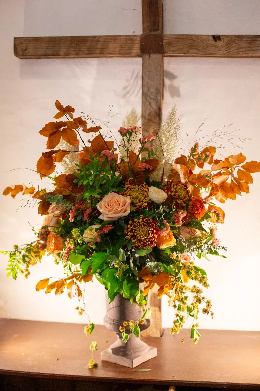 A colorful bouquet of flowers in a textured beige vase on a wooden table, with a wooden barn door in the background.