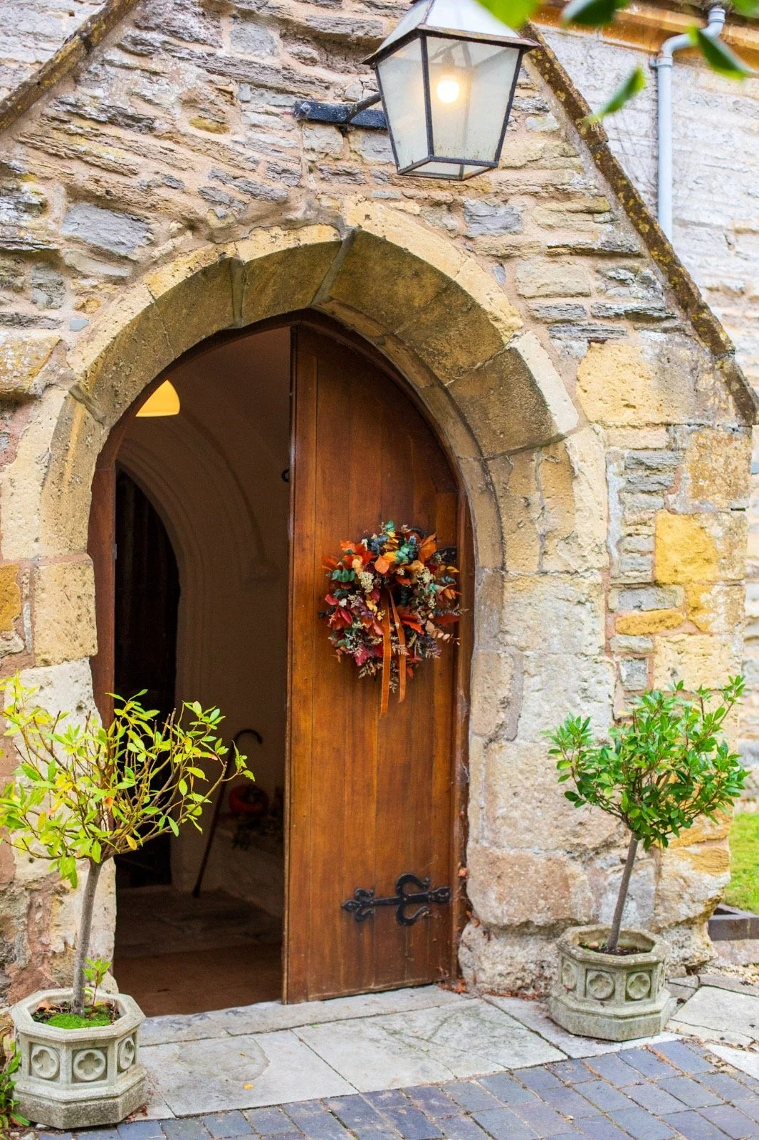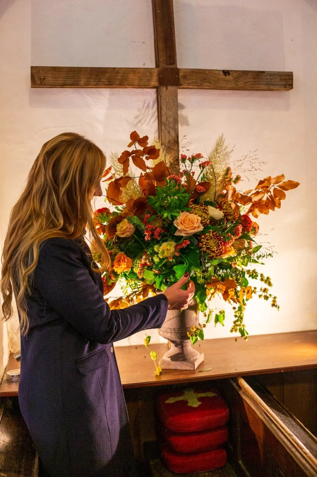 A woman with long, wavy, light brown hair and a beige hair clip looking at a decorative wreath on a dark blue door.